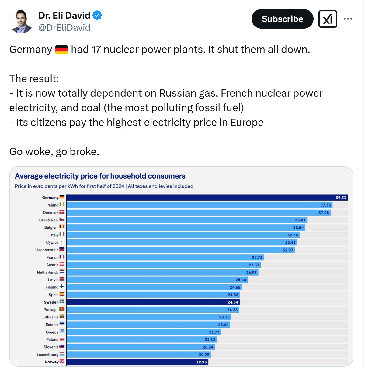 this is the same guy now advocating debt funded power subsidies after making making german energy prices double by adding expensive, unreliable wind and solar, closing their nuclear plants and picking a fight with their primary source of natural gas.