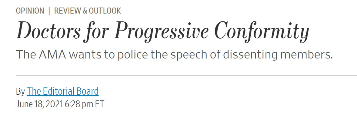 “ Social-media censorship suppressed debate on important issues during the pandemic, and the AMA wants to extend the information control to other health subjects. The new AMA policy would ostensibly encourage Facebook, YouTube and others to remove posts by doctors who question progressive orthodoxy on race and identity politics. “