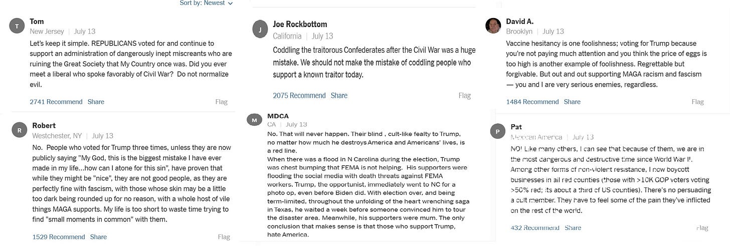 you can see it on livid display in the comment section on the NYT which is flat-out surreal. these are people defined by opposition and hate that think they are the ministry of love.