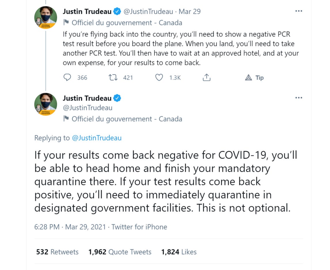 but this bogus truth standard is precisely what canada is using for entry. you need a PCR test before your flight, then they test you again when you land and quarantine you (at your own expense) until the results come back. if they are positive, you are then imprisoned for some unspecified period thereafter. i’m sure some folks are going to buck at this use of “imprisoned” but let me ask you: you are confined to a facility chosen by the government against your will. this is not optional. you are not allowed to leave. how does this not meet the definition of “imprisoned”? what, because a jail has room service and cable, it’s not a jail?