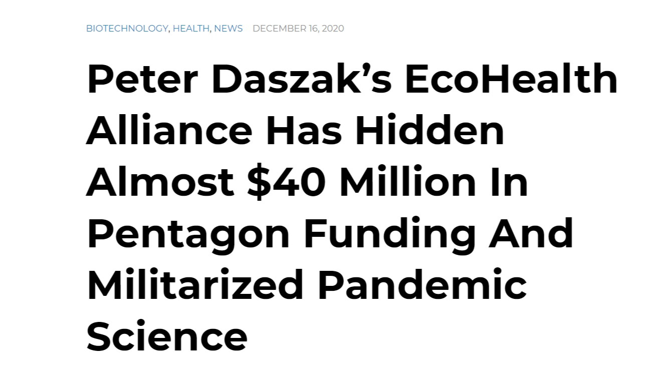 longtime fauci pal zoologist peter daszak has been hoovering up pentagon money for years to fund all manner of virus hotwiring to make them more dangerous. this has been known for a LONG time as was his direct funding of GoF on bat coronaviruses at the wuhan institute of virology, the very place from which covid-19 may have escaped.