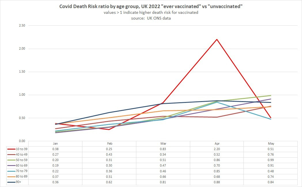 this allows us to create a simple “any vaxx vs unvaxxed” measure of VE/risk ratio by simply comparing the % of overall all cause deaths in each group. the measure of vaccination rate is from 18 dec 2022 (the graphic updated post my downloading the data but is basically the same) and thus might be slightly favoring vaccine efficacy but as only about 3 percentage points of people in the UK got their first vaxx in 2022 (and less than 1% from may to dec) and mostly were likely young it’s probably having little effect apart from maybe in the 10-39 bucket which, i would caution, is less trustworthy than the others as the composite of vaccination rates was wide and complex and injects increased estimation error.