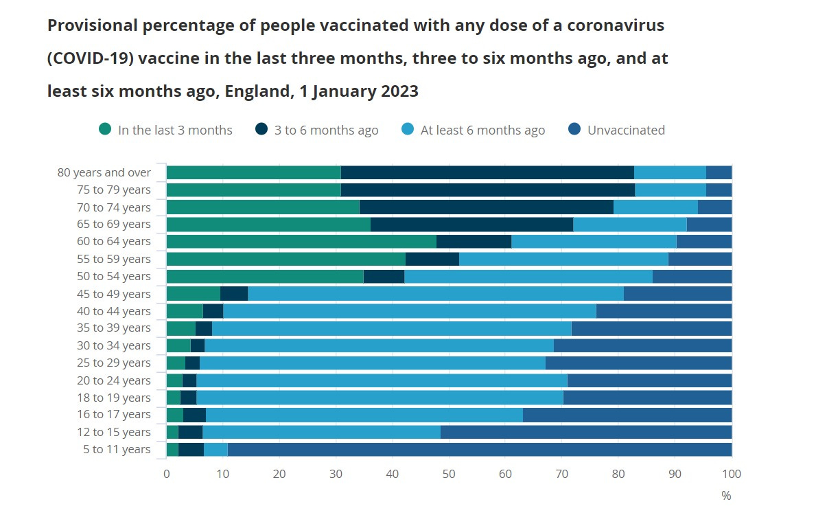 i cross indexed this with another set of UK data on vaccination levels by age that looks like this and had a good count of “unvaccinated.”