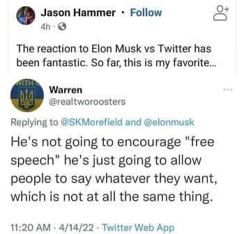 "He's not going to encourage "free speech", he's just going to let people say whatever they want, which is not the same thing."