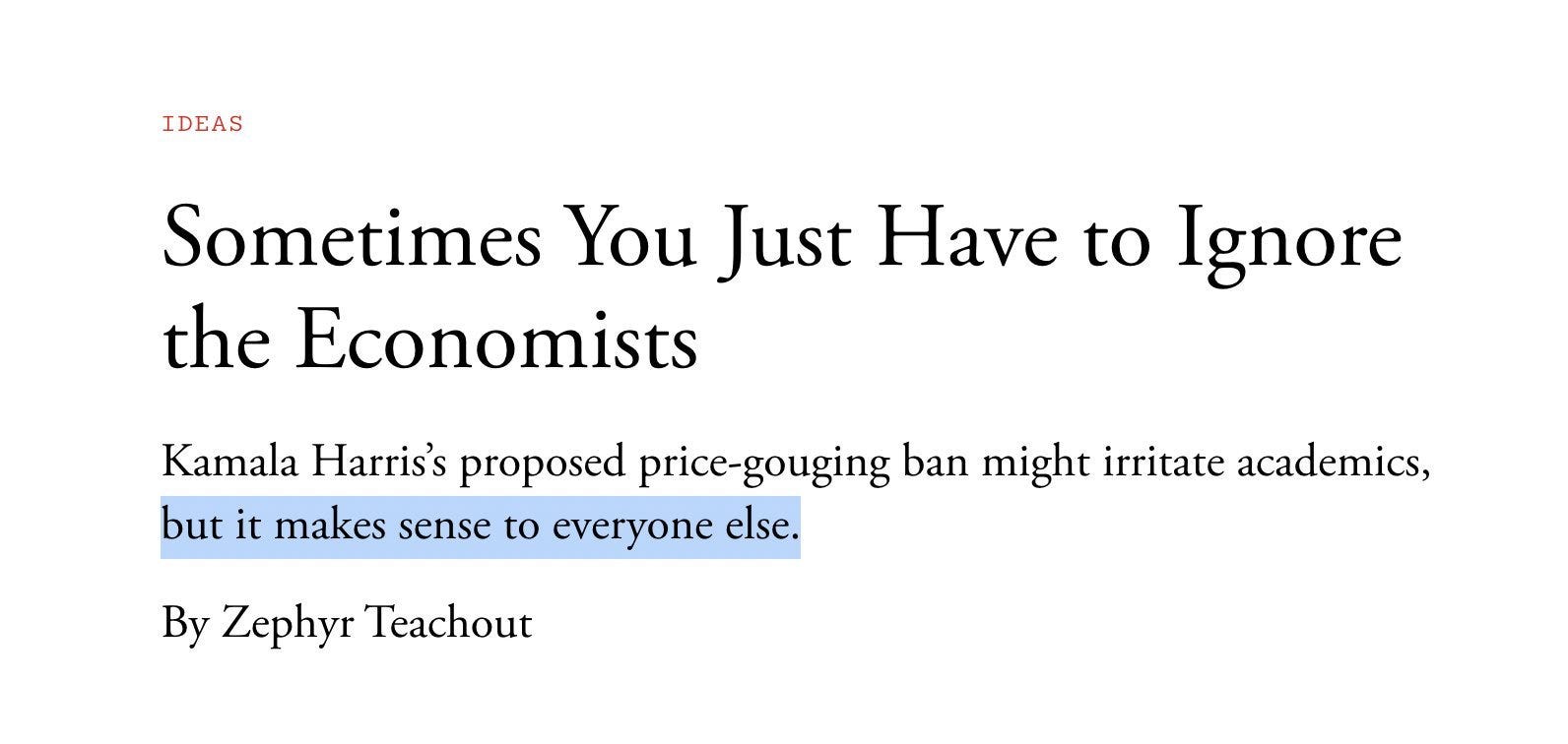 it’s not. instead, it’s a hilarity of reframing to make it seem like kamala just wants to stop “price gouging after hurricanes” and was not trying to use this as a tool to fight inflation. it’s an entirely fabricated argument by straw man wrapped up in seeming academic discussion to mask the slight of hand on fundamental premise. it’s made to fool the fools. and it likely will. (it’s also wrong about gouging post hurricane, that’s when you want high prices to bring supply most of all)