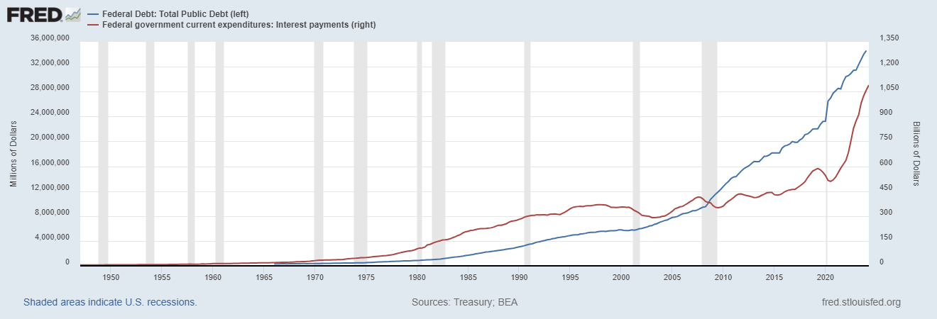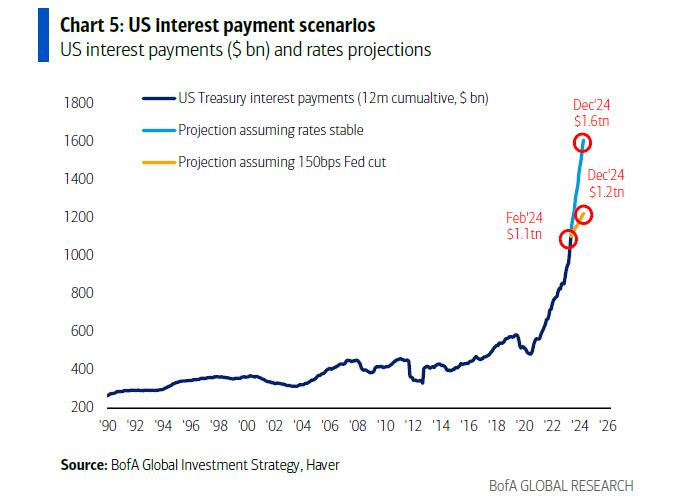 interest costs remained low because of absurdist ZIRP policies run by the early vanguard of the utter fools running policy now and these fools fooled themselves into seeing no problem because debt doubled from $9 to $18 tn and interest costs were flat. then they tripled when rates normalized. (and rates are actually still a bit low by historical standards)