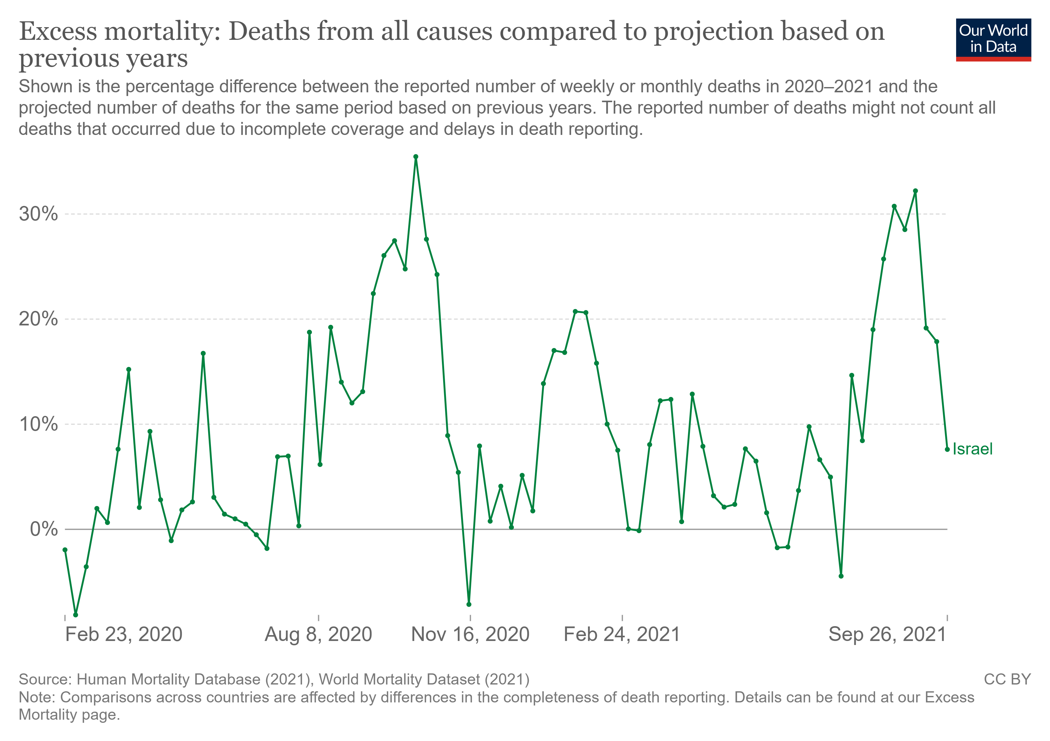 the deaths in israel rapidly flattened. palestine kept rising. people called this a big victory for vaccines. but then a month later, palestine flattened too and that story fell apart. it was seasonal/reporting lag.