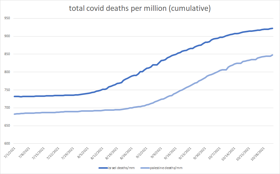 so palestine, who started 7% lower on cumulative death, still wound up at a 3-8% lower cumulative number overall.