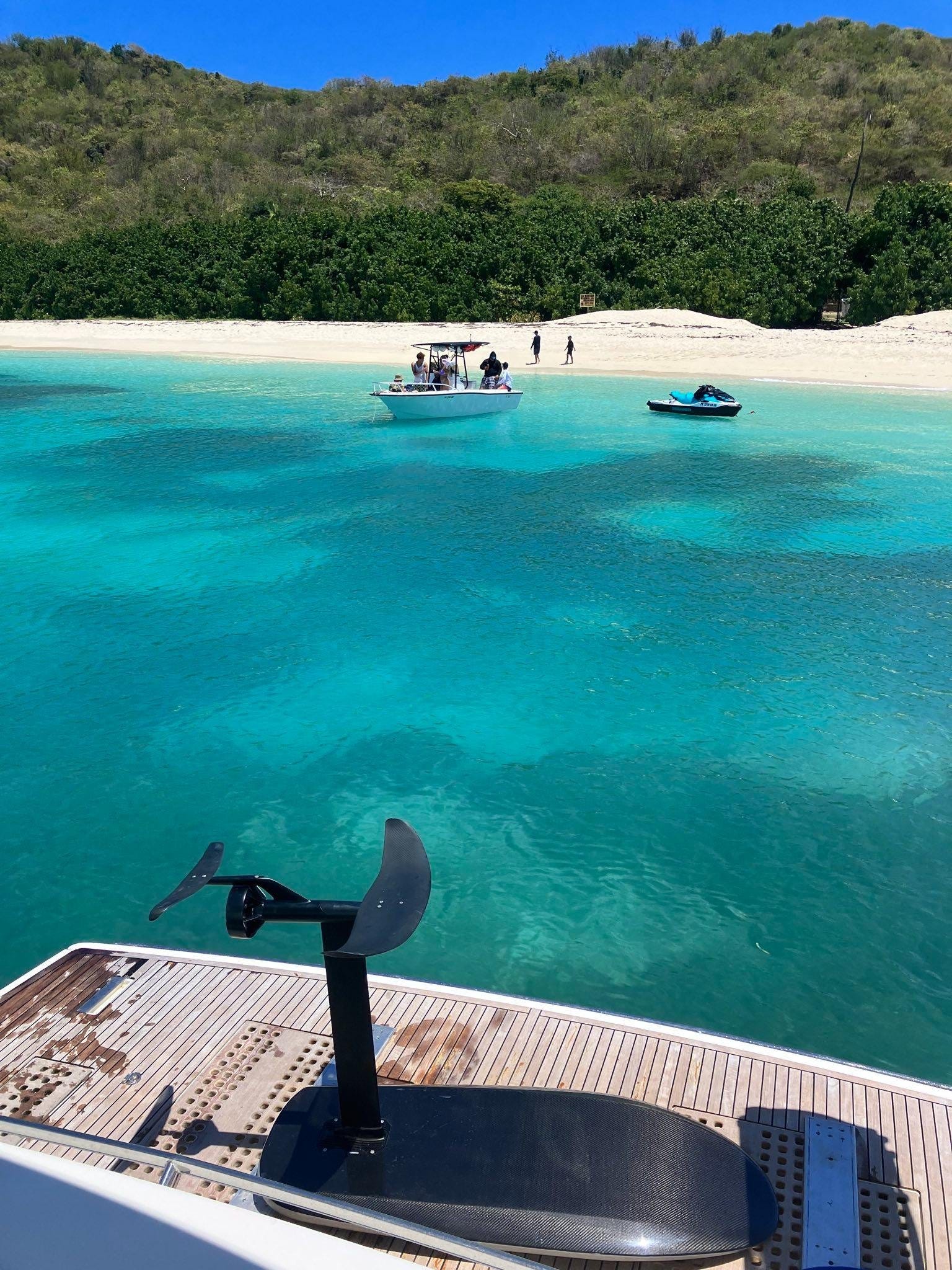 it’s a high powered electric motor driving a propeller that will lift the board 30 inches out of the water and let you ride on the foils at ~25mph. it’s like flying over the ocean.