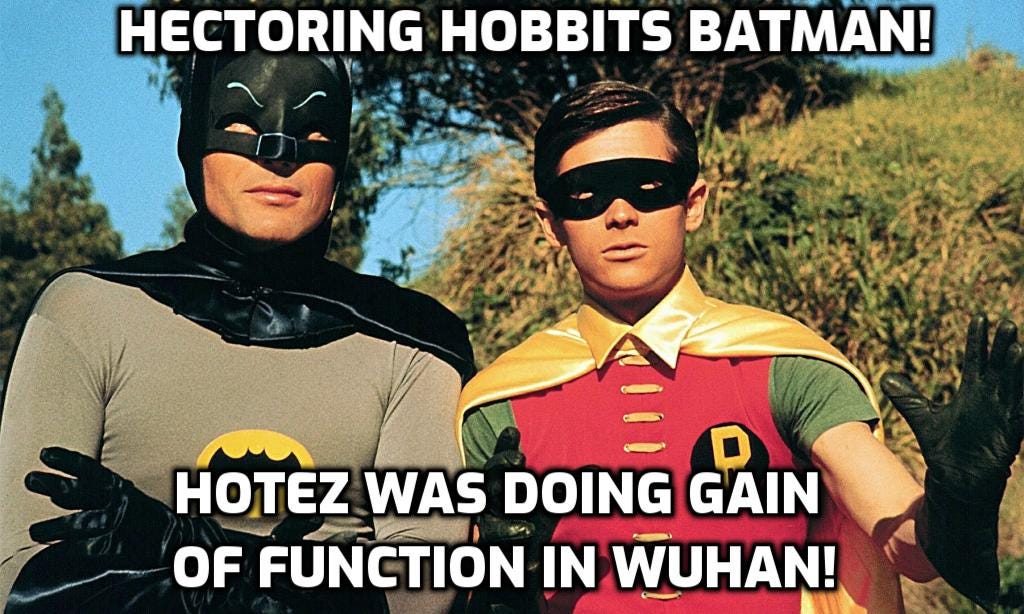perhaps it had something to do with the fact that hotez was, quite literally, collaborating with zhengli shi, wuhan institute of virology’s infamous “bat lady” who has been dead center of the whole covid mess on, wait for it…