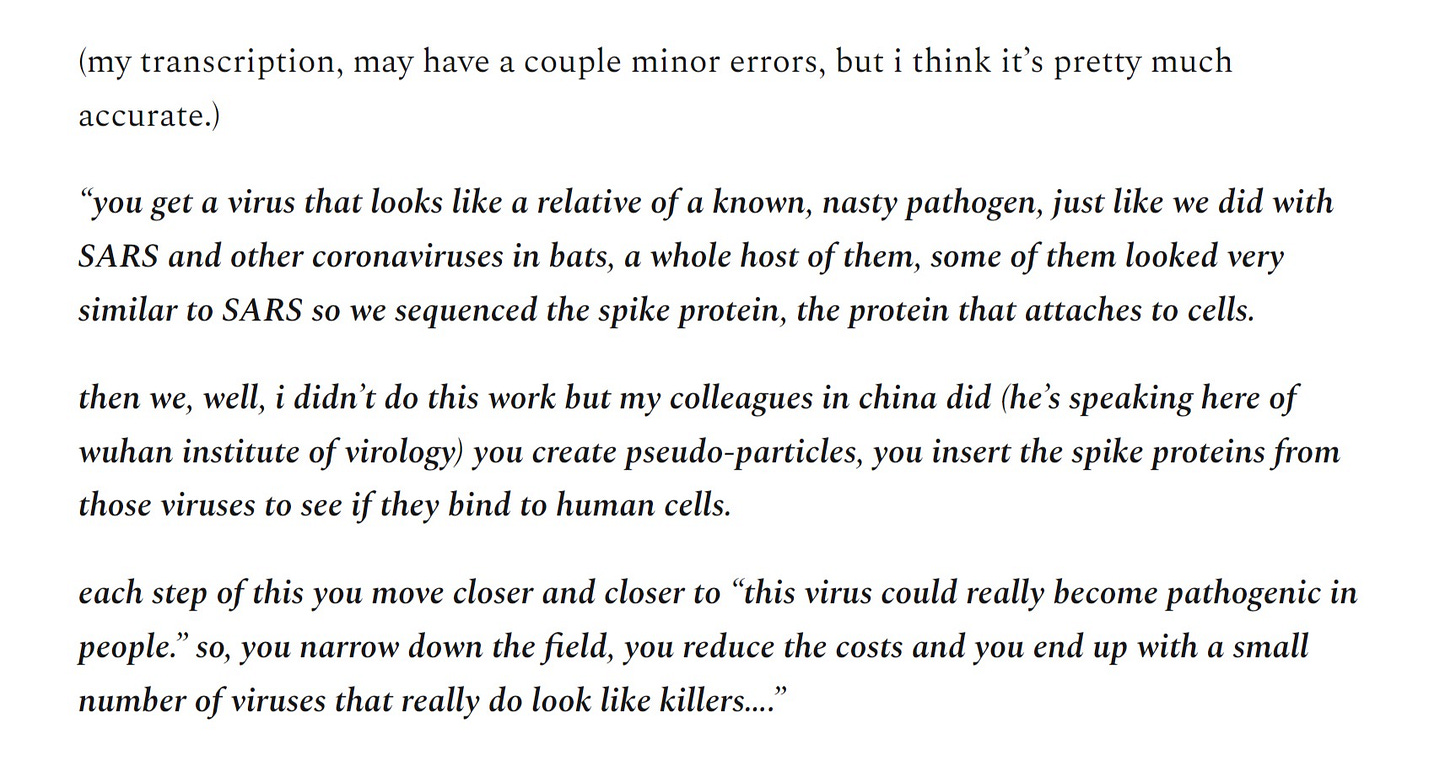 they were all there, thick as thieves, serially passaging bat coronaviruses through mice to amplify their virulence a thousand fold or more, making them infective in humans, and working on the same sort of inoculation vectors that suddenly emerged from the NIH and got licensed to pharma as a basis for covid vaccines.