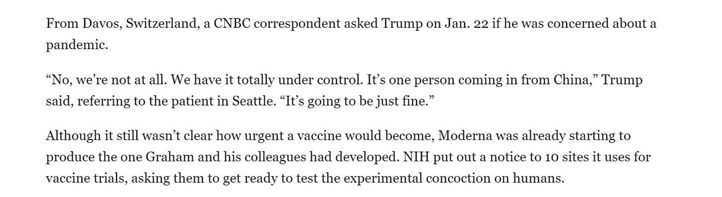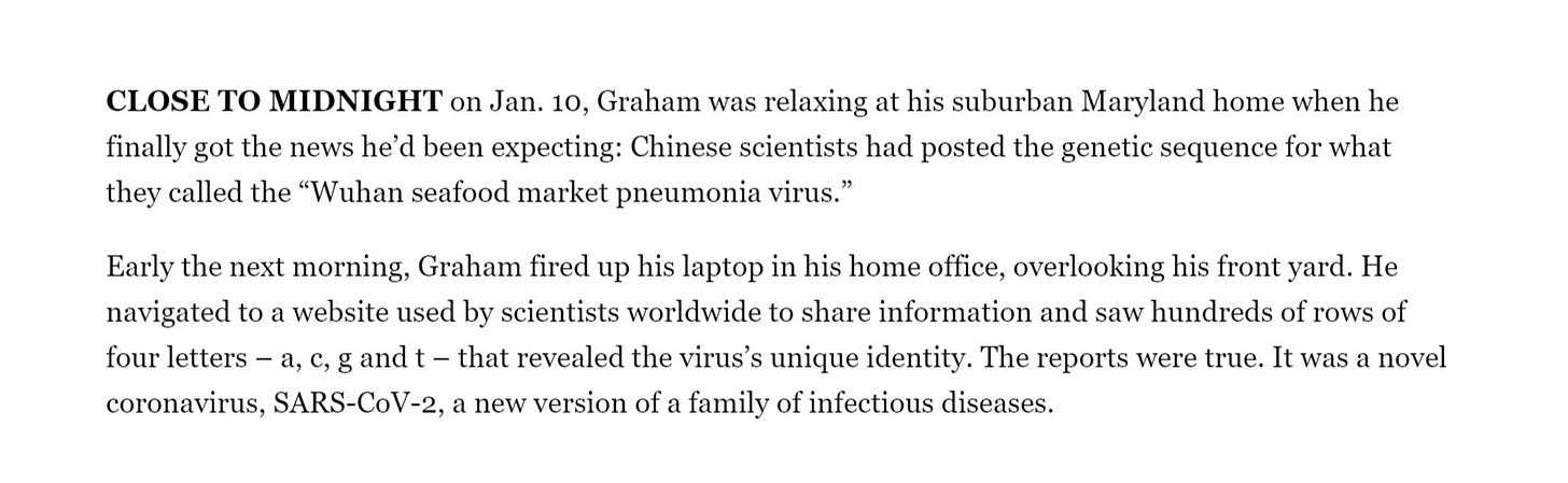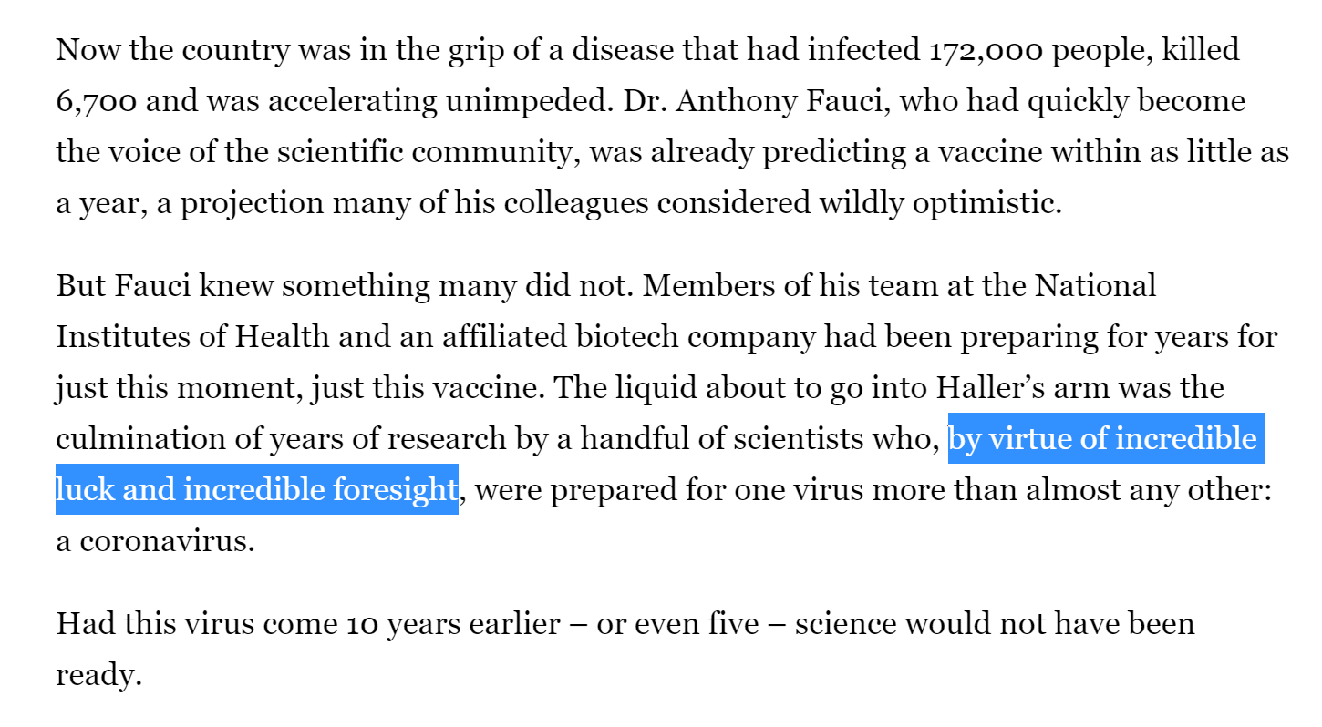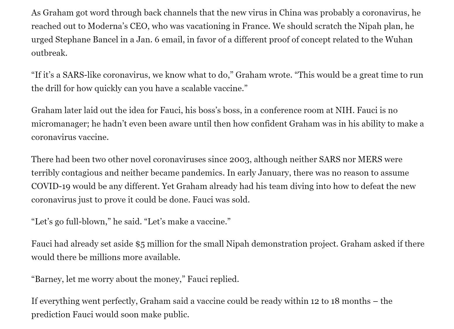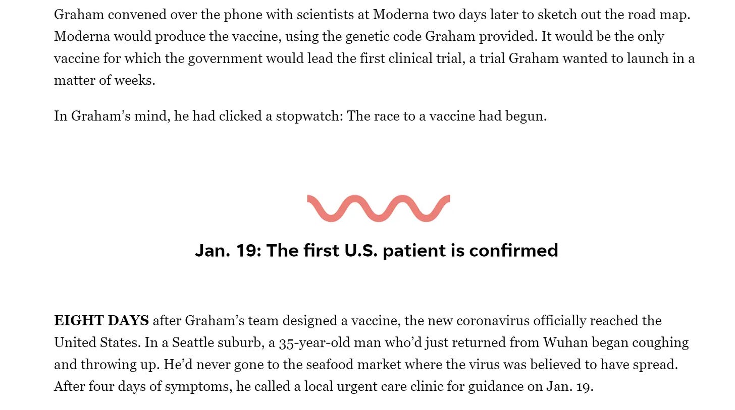 suddenly an email from barney graham, director of vaccine research at NIH on january 6th led them to “design a vaccine in days” because “they had a head start on coronaviruses” through the team led by graham. (long walk through HERE)