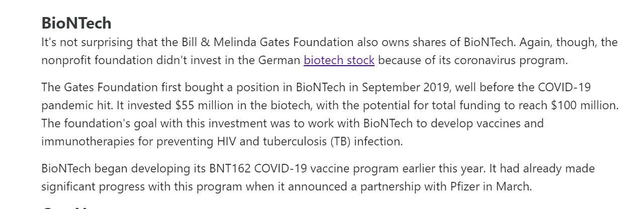 adding to this, the gates foundation made a killing on covid, some of it very suspicious in its timing. the BMGF has been a longstanding investor in pfizer. but look WHEN they bought biontech, the company that partnered with pfizer on the covid vaccine (bringing the key technology and know how).