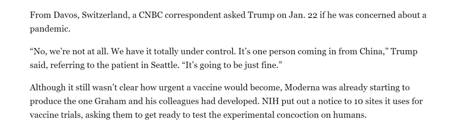 and suddenly, sleepy moderna, a hype factory without a product to its name and that used to elicit such broad criticism for theranos-like secret data that even “nature” called it “not fit to print”, leaps to the fore in days with a product for just the emergency at hand despite having never managed to produce another vaccine in the 4 years before because “the NIH just happened to have one laying around?”