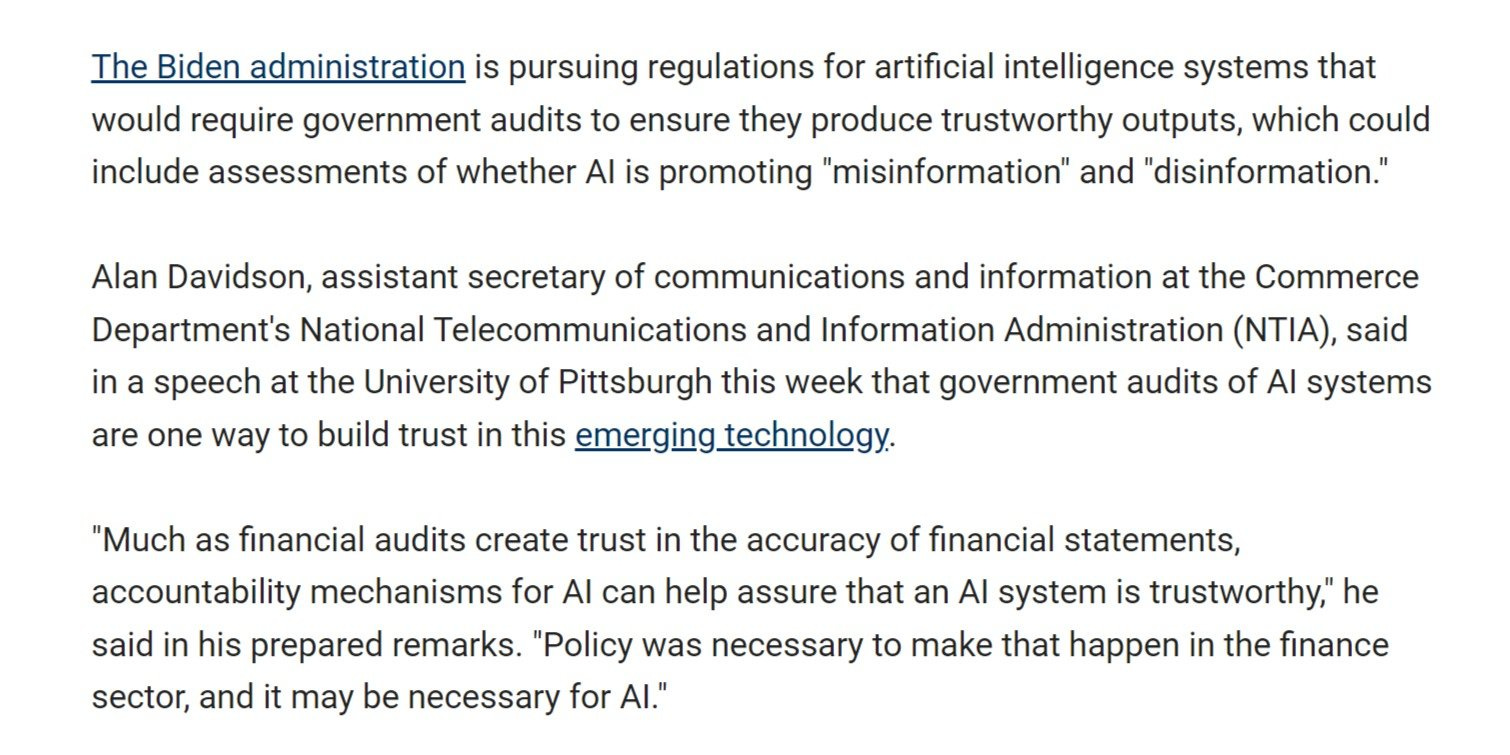 we want the power to determine how we slant and regulate AI to our own ends and will, of course, take plenty of advice and regulation from the truth ministries once we figure out what angle this field needs to have in order to keep our competition out of it and concentrate market share.