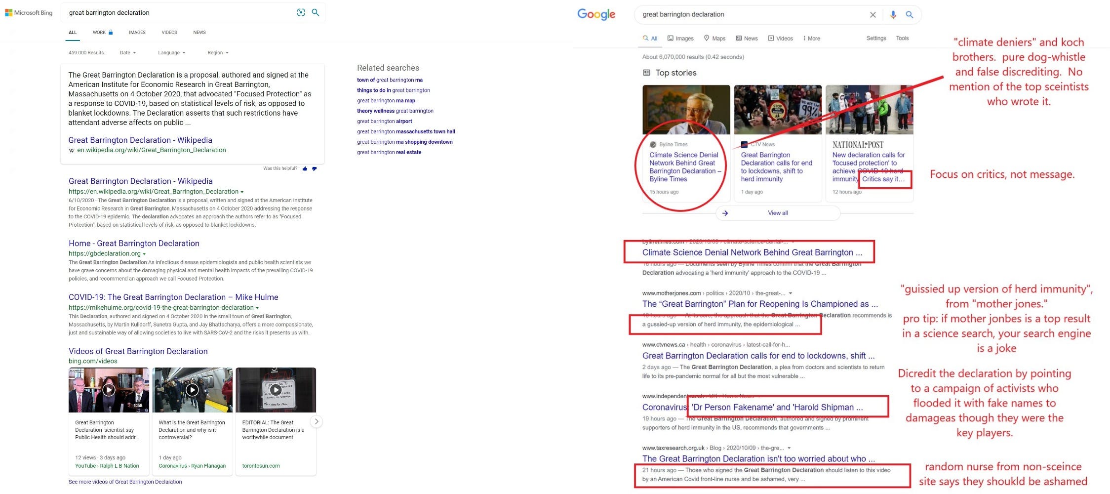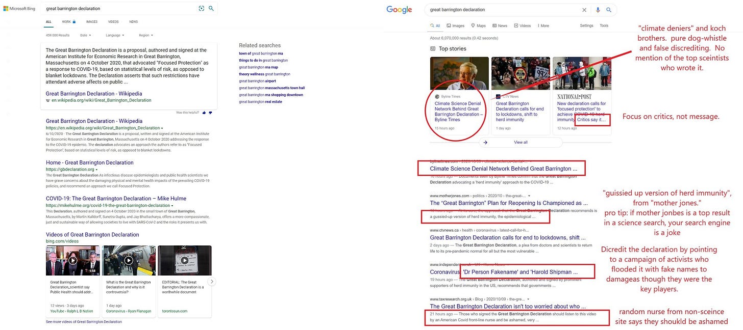 you can see bing (L) vs google (R) and see that for some times and until actual senators complained, google was making the great barrinton declaration impossible to find and seeking to somehow tie it to “climate change denial.”
