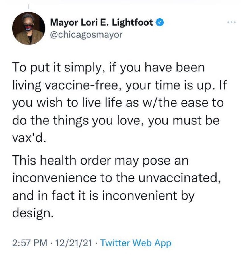 Itβs no wonder 113,776 people left the state of Illinois in 2021, the 8th year running of population decline. Lightfoot is destroying a once beautiful, safe, great city. Worst mayor is in history. Iβve talked to small business owners in the City who say they will not comply with this new mandate which is clearly not based on science/public health.