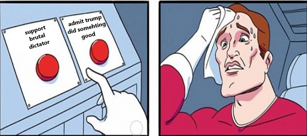 and watching the US left, the EU, and the UN all tut and fret about supporting a group that just won the nobel peace prize is really quite telling. when asked to choose between any ethics at all, no matter how obvious, glaring, or compelling and “orange man bad” few even seem to need to stop to think. it’s easy to simply presume that TDS dominates utterly, but i think it’s worth looking a level deeper: why is this TDS so universal among the global left?