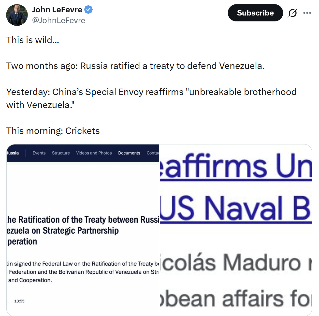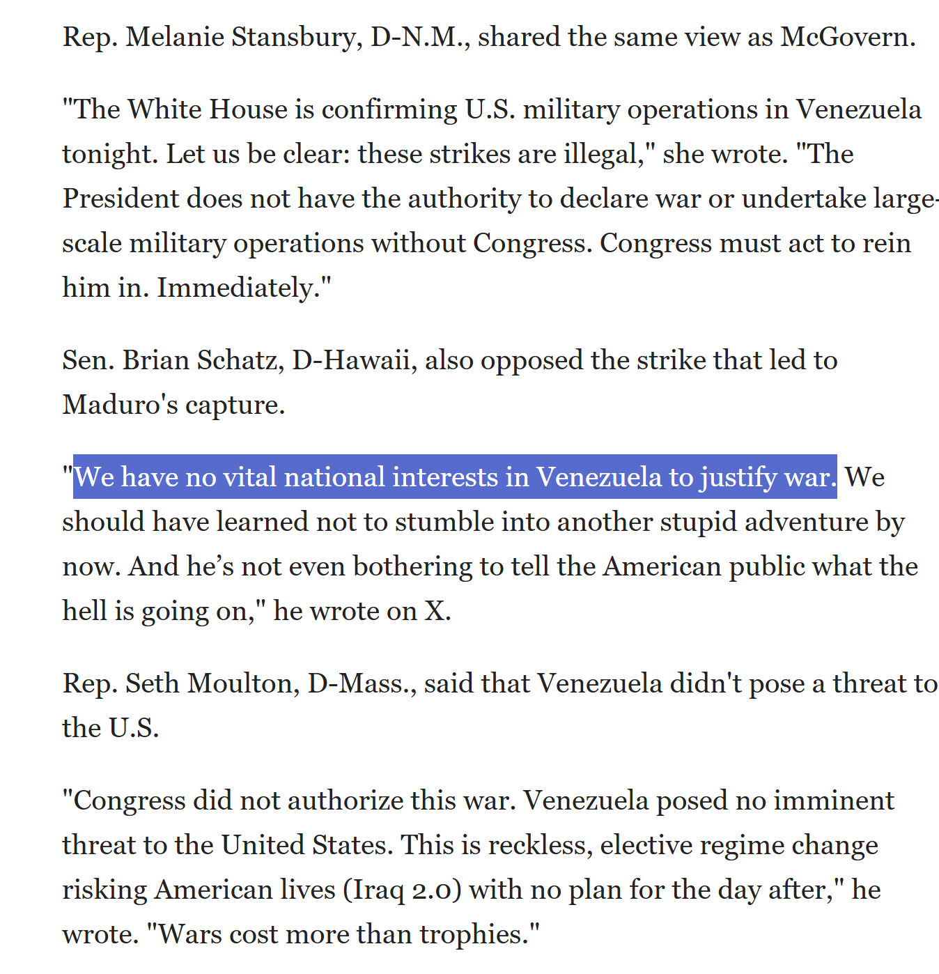 mostly, what this gang does not like is that this was a very strong power move. both china and russia had been supporting this client state in our backyard. china literally had a delegation there in caracas seeking more oil and more influence when this went down. i’m guessing they got the message and ideas like “the US is only there for the oil!” fall kind of flat when one returts “and what, russia, china, and iran were there for the arepas and salsa dancing?”