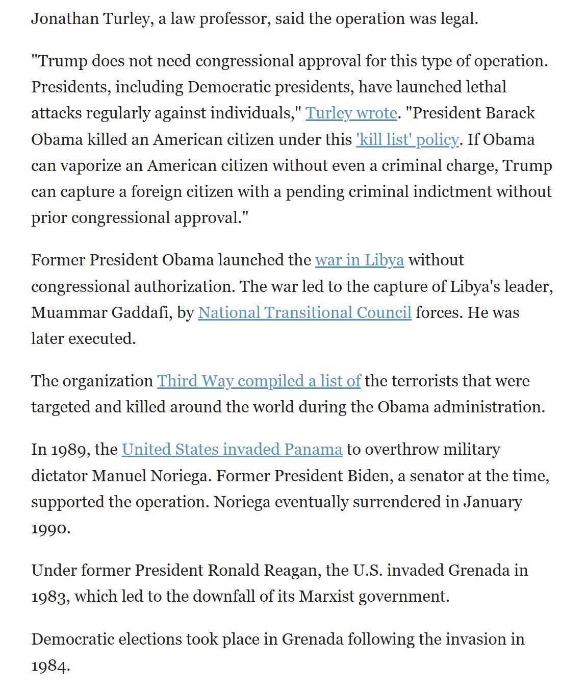 the EU aristocrats are also making all the noises one would expect and bleating appeals to the hilarity of “international law” which, let’s face it, is not and has never really been a thing. it’s the rulebook the weak wave around at the strong and use as a pretext to go do what they were going to do anyway. the US played along with the fig leaf of “this was a DEA action to arrest an indicted narcotrafficker” to humor them but they (reasonably enough) don’t seem to be buying it.