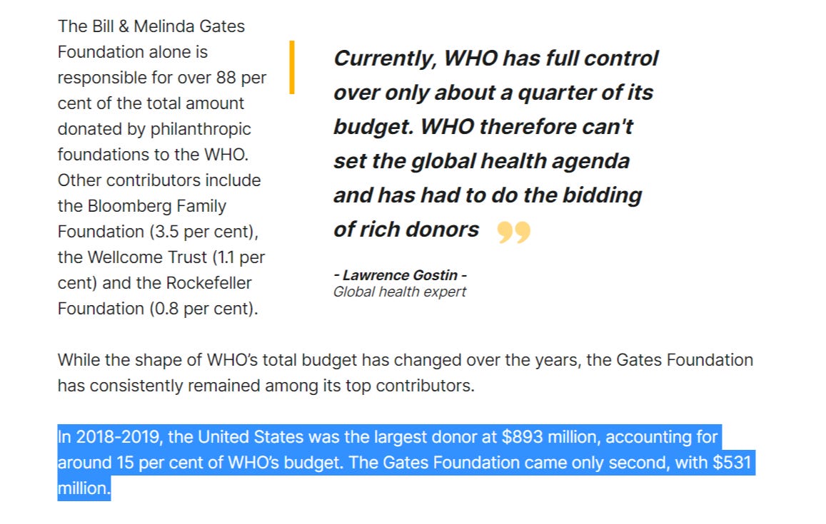 if you’re going to make a big push into selling vaccines and drugs, why buy mere lobbyists when you can buy the WHO? gates is by far their largest private donor, 25X the size of the next biggest and was their number 2 donor overall.