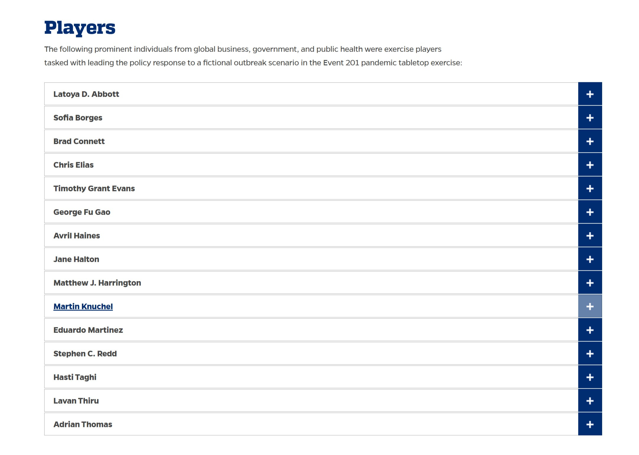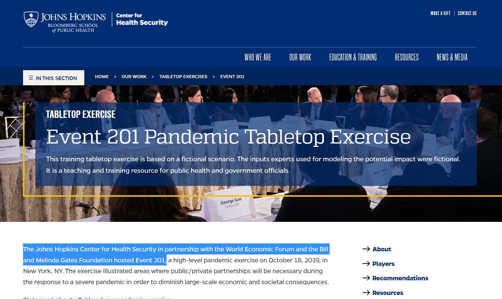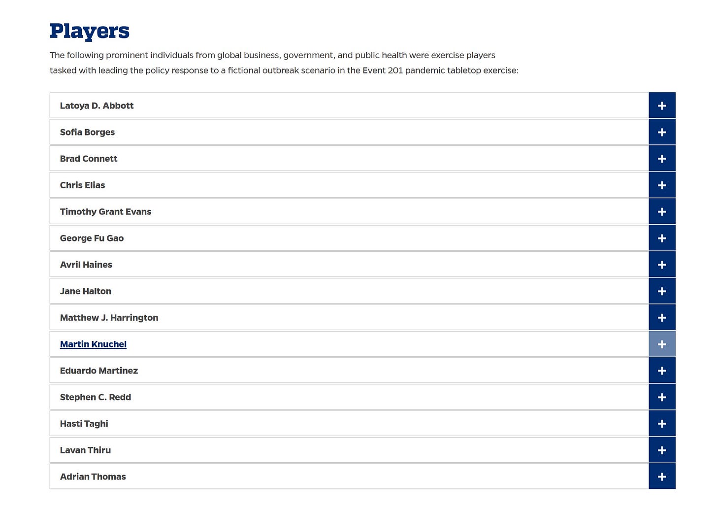 the “players” were a high powered gang including big business, healthcare companies, the UN, the head of china’s CDC, a number of academics, the head of US CDC preparedness and response, monetary authorities, and media firms.