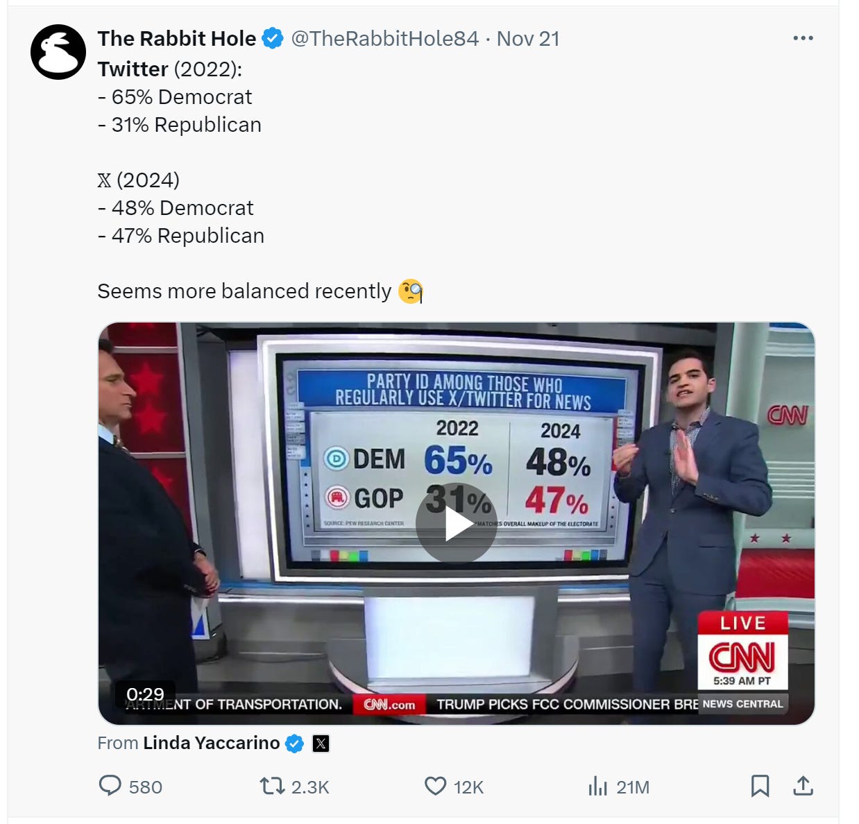 but twitter has not become “right wing.” it has now become “balanced” and “representative” as it shifted from 65% blue 31% red in 2022 to 48% blue 47% red today.