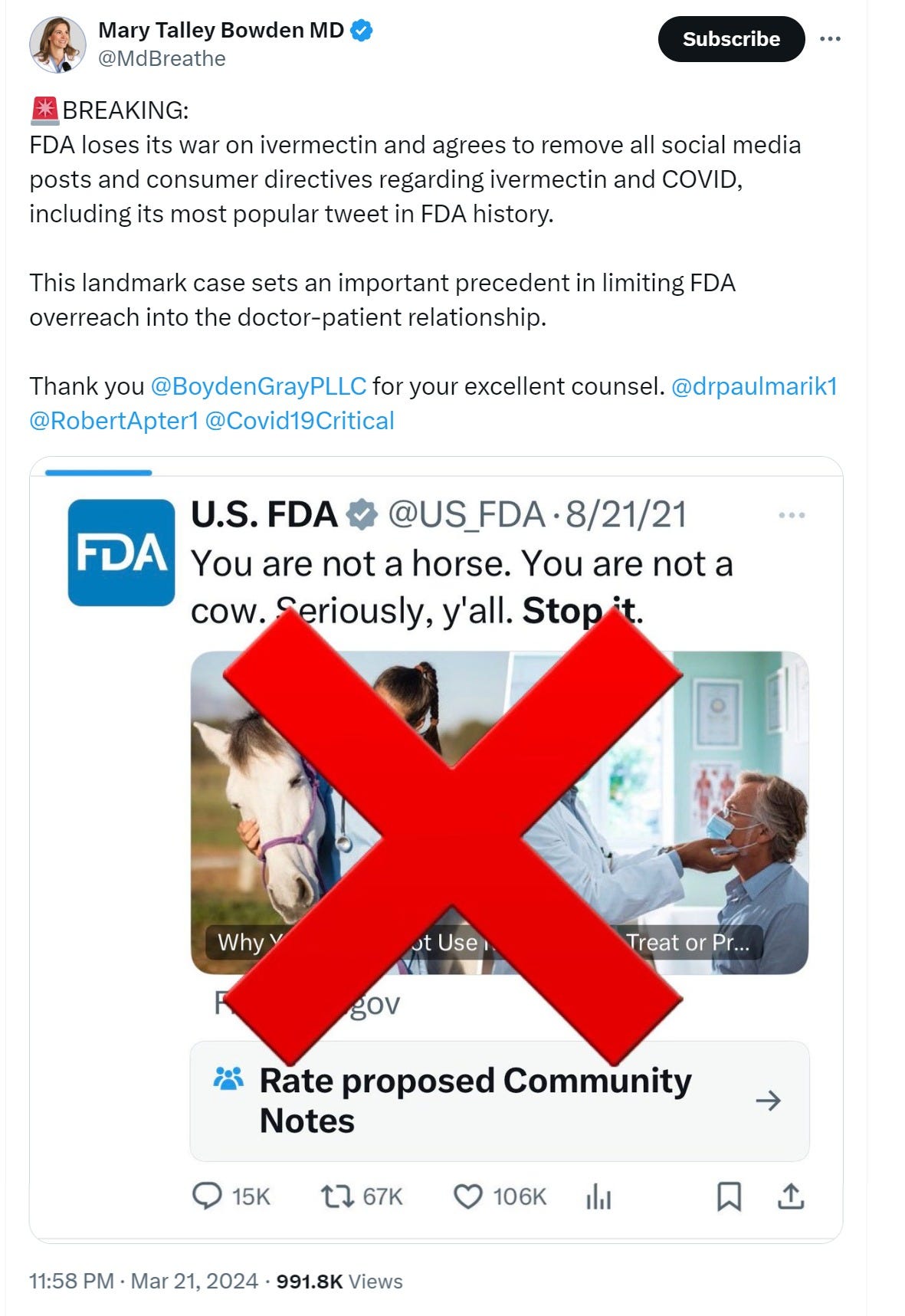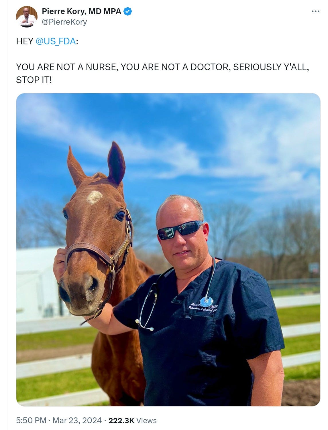 but let’s not bog down there. whatever one feels about efficacy, that was NOT the argument the FDA was making nor the dangerous course they took. they came out implying “this drug is not for humans, it’s for livestock” and that is simply false. billion of humans have taken this drug. its inventor won the nobel prize for it. it’s cheap, available in huge quantities, and very, very safe, or, at least it was until the FDA made it unsafe.
