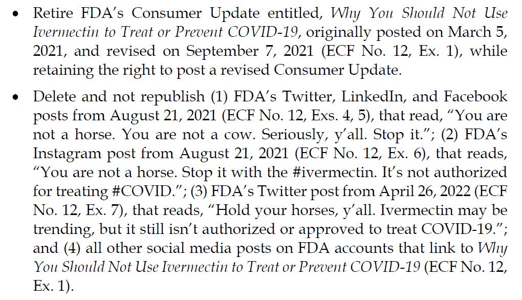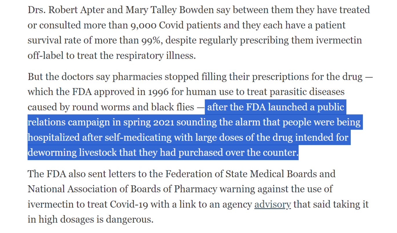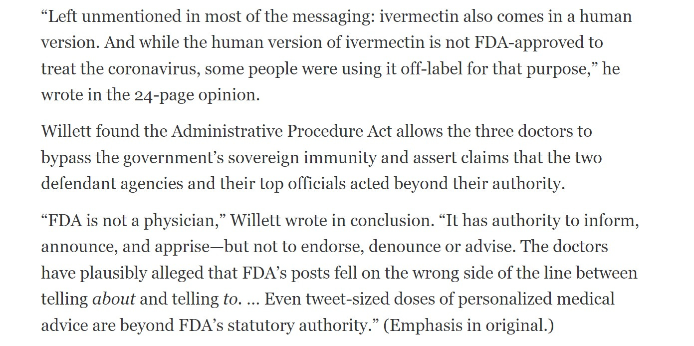 and this was a big deal, a dispositive deal. why? because they shut off the human supply and (like they did with hydroxychloroquine) reached out to boards and agencies and barred its prescription. this is simply not done. 1000’s of drugs are used off label. it’s common as muck and generally safe and effective. it’s what doctors do. what is NOT safe or effective is to prevent this and drive people to unsafe ideas like “taking veterinary versions in dosages appropriate for a 900 pound horse.”