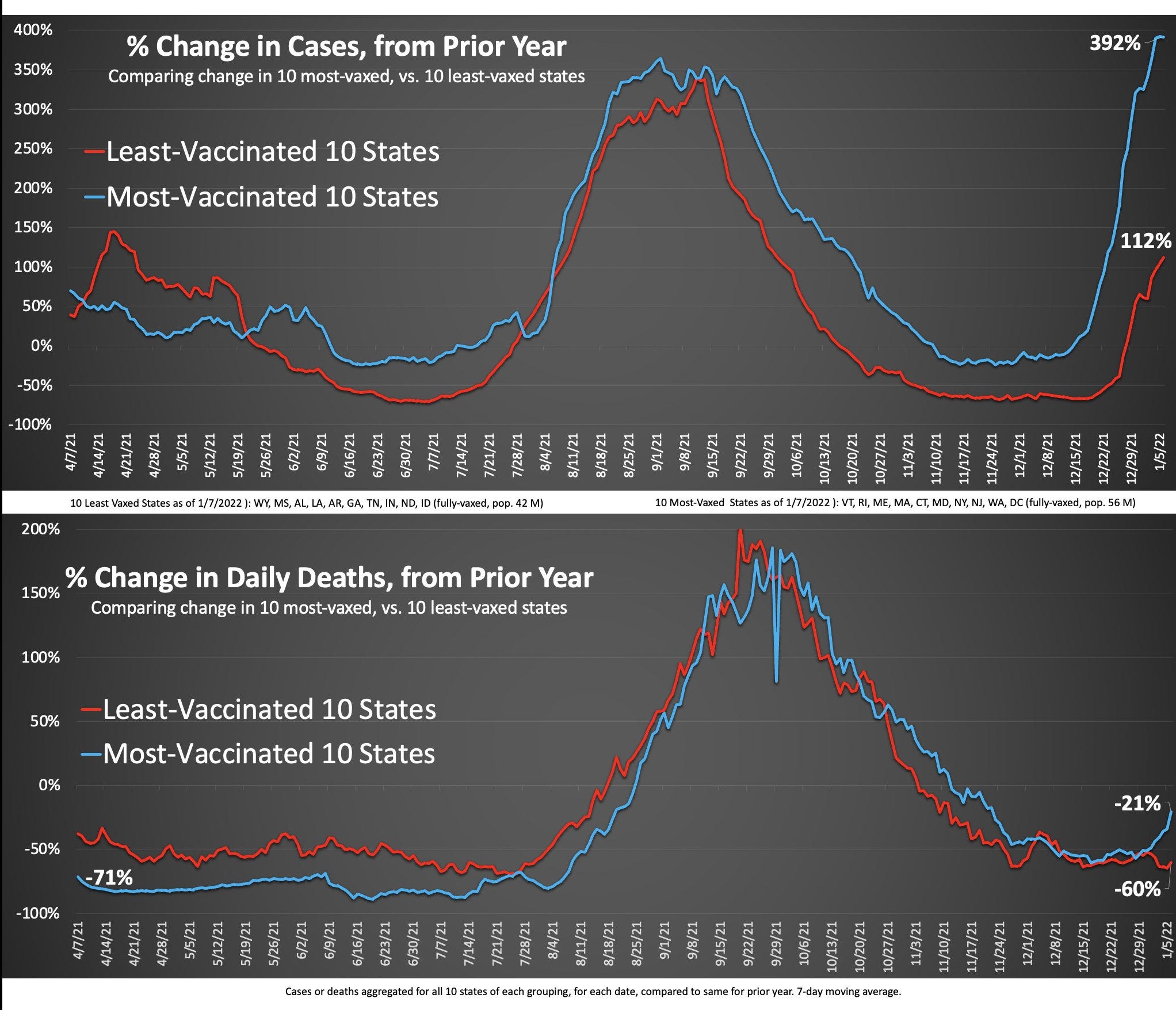 longtime gatopal™ emily burns created this graphic. in it, she compares as aggregates the 10 most vaccinated states and the 10 least and benchmarks them off their own performance a year ago to control for seasonality, risk, etc.