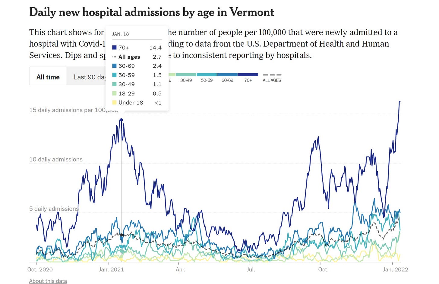 hospitalization is a bad metric in many ways due to miscounts of “with” for “from” etc, but that issue has, at least, been with us all along, so we can compare states to themselves this year vs last and look only at highly vaxxed cohorts.